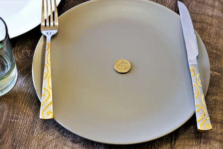 Gold coin on a plate. Australian Dollar coin on a plate with knife and fork