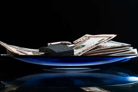 On a glass table there is a blue plate on which there is a bundle of banknotes. On top of the banknotes is an open lock with a key. The concept of success, startup, banking.