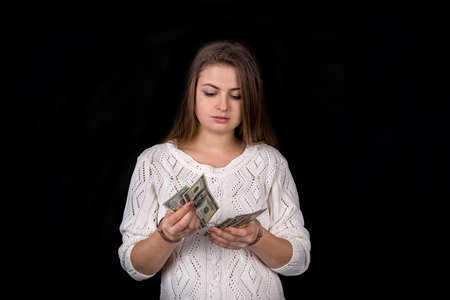 Lady in handcuffs counting money, isolated on black
