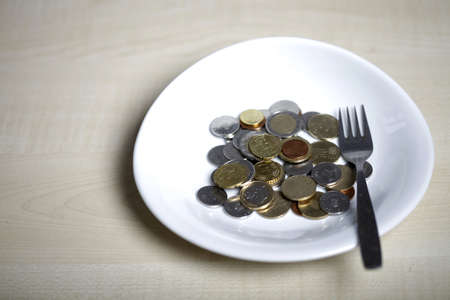 Many coins on a white plate and a fork