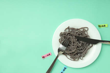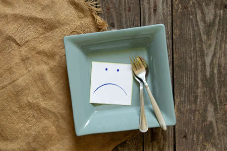 sad udibka drawn on a piece of paper lies on an empty plate on the table, sadness when there is nothing to eat, hunger and bad mood