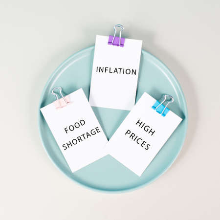 Plate with messages on paper, inflation, food shortage and high prices, increasing living expenses and poverty, financial crisis