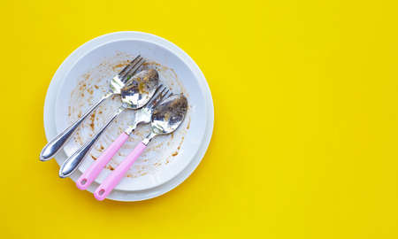 Dirty dishes with spoon and pork on yellow background. Top view
