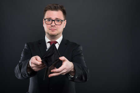 Portrait of business man showing empty wallet on black background with copyspace advertising area