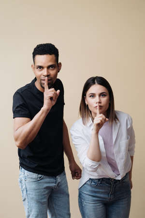 Mixed race couple make shush gesture with surprised expressions, ask not spread gossips, isolated over beige background