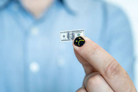 Hand holding miniature dollar note. the concept of dollar inflation. a small salary for an employee. man with painted nails. Design of male nails. men manicure.