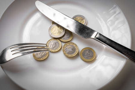 Euro coins on an empty white plate. Symbol for crisis or cost of living, price of food concept