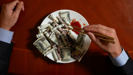 Hands of a businessman with chopsticks and dollar rolls. eating dollars