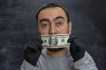 The bribe taker holds a hundred-dollar bill in front of his mouth.