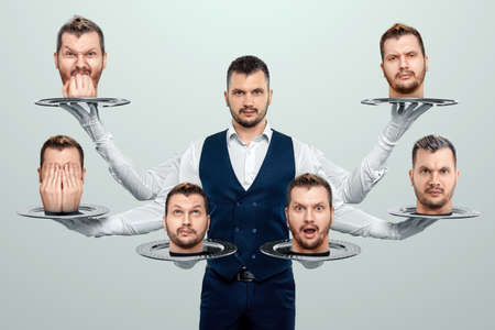A man holds many faces on trays. The actor changes emotions, different moods, split personality, different emotions. Anger, lies, fear, joy. creative design, magazine style