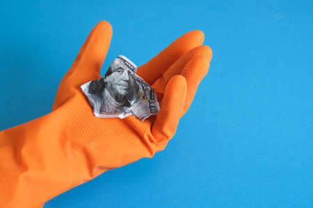 hands in orange gloves wash money with soap on a blue background wet 100 dollar bill in hands