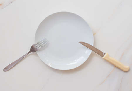 Empty white plate with cutlery on a marble table, saucer, fork and knife. The concept of diet, fasting