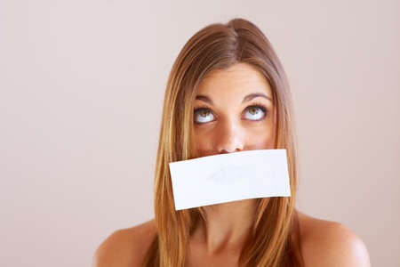Mouth shut. A young woman with copyspace stuck to her mouth.