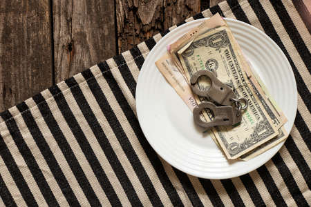 american dollars lie on an old wooden table next to handcuffs, finances and corruption