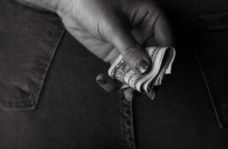 Woman hand taking money from jeans back pocket. Woman hiding money behind her back. Dollar banknotes close up