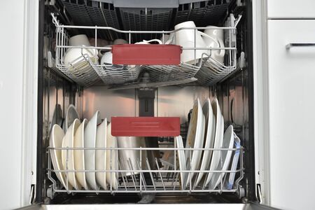 Open door of built-in dishwasher with clean plates and dishes at kitchen. Housework