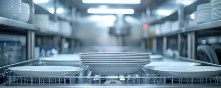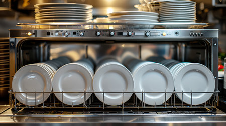 industrial dishwasher with dishes and utensils ready for use, created with generative ai