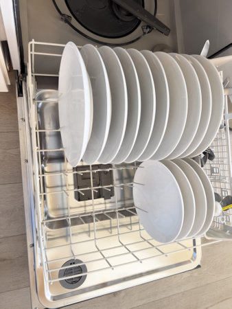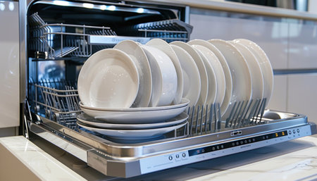A detailed shot of a tidy kitchen dishwasher interior showing spotless white dishware and precisely organized utensils, bathed in gentle lighting with a blurred contemporary bac