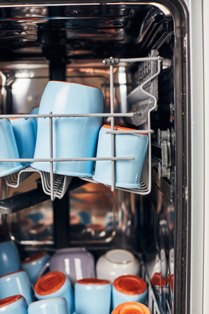 Clean dishes in dishwasher. Freshly washed dishes, plates, cups, jars, mugs, cutlery, pots. Concept of hygiene, household, home care, water saving, technologies and helpers in everyday life.