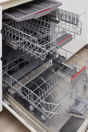 Close-up view of an open empty automatic dishwasher in kitchen. Modern kitchen appliance. Housekeeping equipment, Household chores.