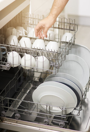 Modern kitchen dishwasher with white dishes for electronic washing device in stylish setting