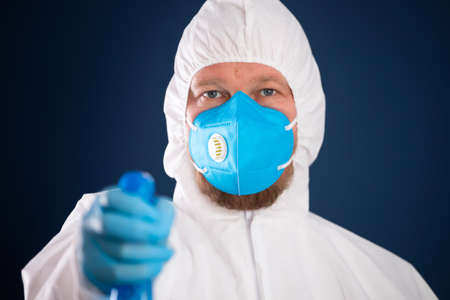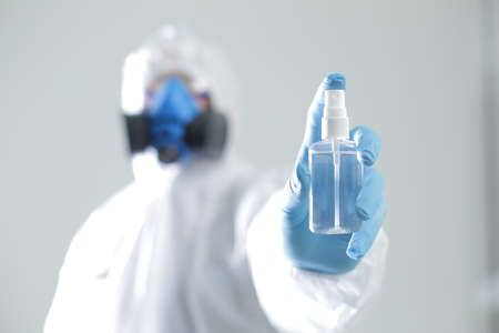 Doctor in a protective suit in a respirator of protective glasses holds an antiseptic spray in his hand