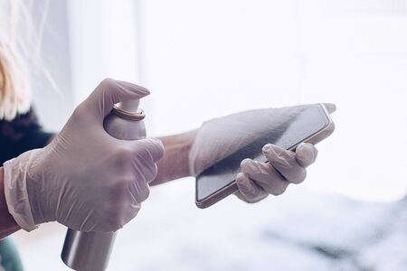 Hand in protective glove with alcohol spray cleaning mobile phone. Covid-19 disinfection concept.