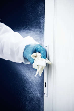 Disinfection, cleaning and washing of door handles. COVID-19. Prevention of coronavirus infection. A woman in a protective suit and blue gloves sprays a disinfectant solution. Prevention of coronavirus infection.
