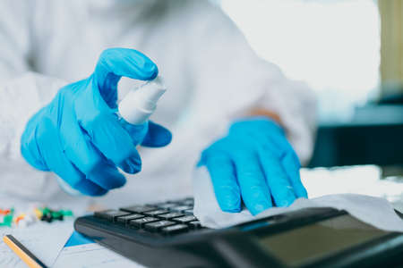 Scientists are cleaning calculate by alcohol and tissue after checking and testing virus on labtop at home.