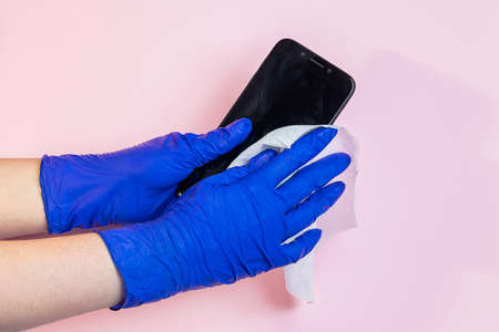 Hands in latex gloves disinfect the smartphone with an antiseptic. The concept of preventive protection against coronavirus. Health care during a pandemic.