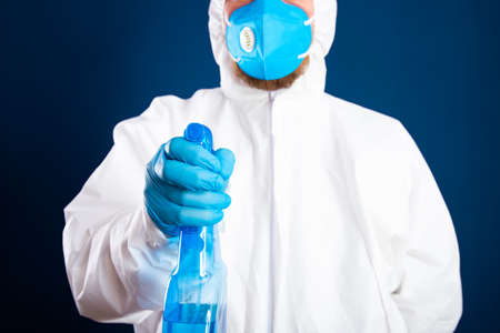 Male worker wearing protective suit while using disinfectant spray to prevent coronavirus transmission in the studio with brown background