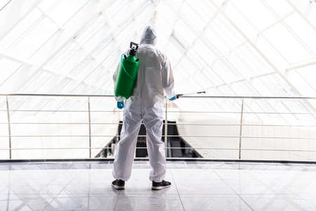 Back view of disinfectant service worker wearing protective suit while spraying train station with disinfectant during coronavirus pandemic