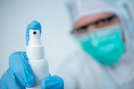 Doctor in protective suit and surgical mask use sanitizer for Coronavirus. Preventive measures against Covid-19 infection. Ðntibacterial gel alcohol-based hand-washing spray. Epidemic virus outbreak