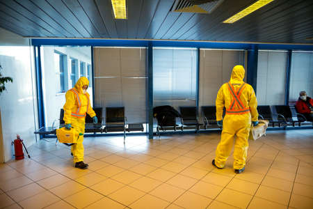 UKRAINE, KYIV - May 20, 2020: Sanitizing interior surfaces. Cleaning and Disinfection inside buildings, the coronavirus epidemic. Professional teams for disinfection efforts. Infection prevention and control of epidemic.