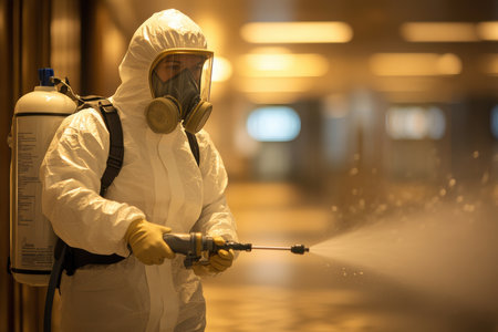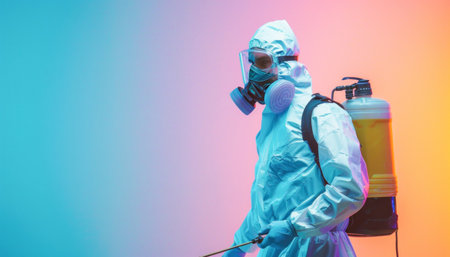 Against a lush green backdrop, a person in full safety gear and mask stands ready with a sanitation spray device, emphasizing the crucial importance of hygiene today.