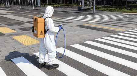 Man in protective equipment decontaminating and spraying on a public place as a prevention against Coronavirus disease 2019, COVID-19. Coronavirus pandemic.