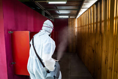 Professional male worker In protective clothing and masks are spraying disinfectants, cleaning, controlling virus and bacteria in the contaminated area After the spread of coronavirus or COVID-19