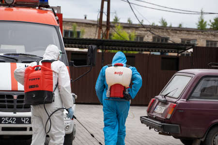 UKRAINE, KYIV - May 20, 2020: Man in a white protective suit and mask is standing near a car and preparing to sanitizing interior surfaces inside buildings while the coronavirus epidemic.
