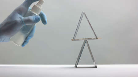 Hand with gloves holds a disinfectant dispenser and spraying on a surface.