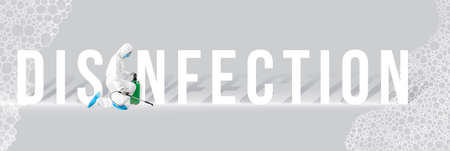 Word DISINFECTION with worker in biohazard suit on gray background
