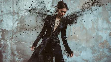 Fashionable Woman in Designer Black Suit with Dynamic Splash Background