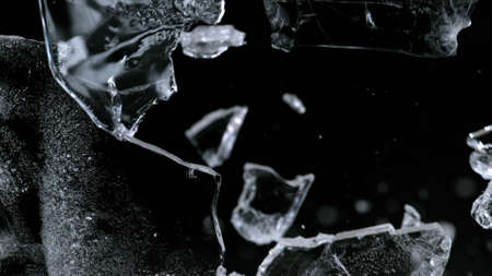 Ice, crushed on black background. Shards of crushed ice spreading away. The explosion of ice.