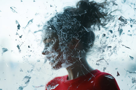 A striking representation shows a human silhouette made of shattered pieces symbolizing the complexity of emotions. The background is a vibrant pink enhancing the piece's impact.