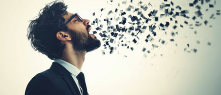 A man in a formal suit stands with glasses exhaling small pieces of confetti symbolizing celebration and joy in a creative display.