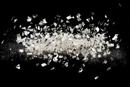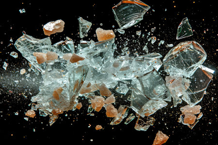 Shattered glass pieces scattered dark surface, reflecting light and surrounded by droplets of water, create dramatic and intriguing visual. sharp edges and glistening surfaces evoke sense