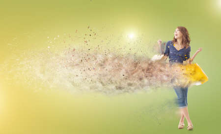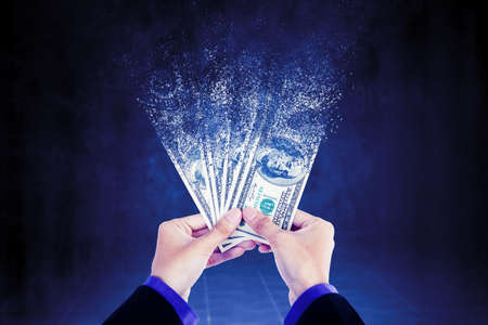 Hyperinflation concept. Businessman hands holding dollar banknotes changing be scattering particles