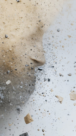 A sculpted face appears to emerge from a base of dust and debris, blending seamlessly into the white background. The artwork conveys themes of fragility and impermanence.