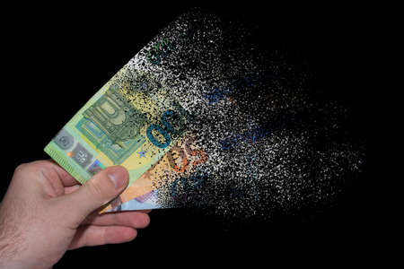 three euro bank notes held in one hand decomposes and dissolves due to inflation with black background