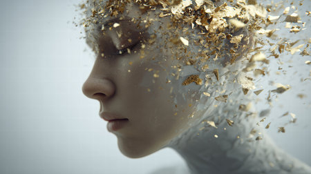 Young woman with face pieces detached, symbolizing prosopagnosia or face blindness diagnosis, portraying distorted memory and identity.
