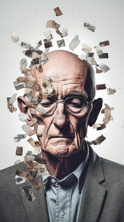Small pieces dissolving head of senior grey-haired woman mental and cognitive disorders dementia .generative AI